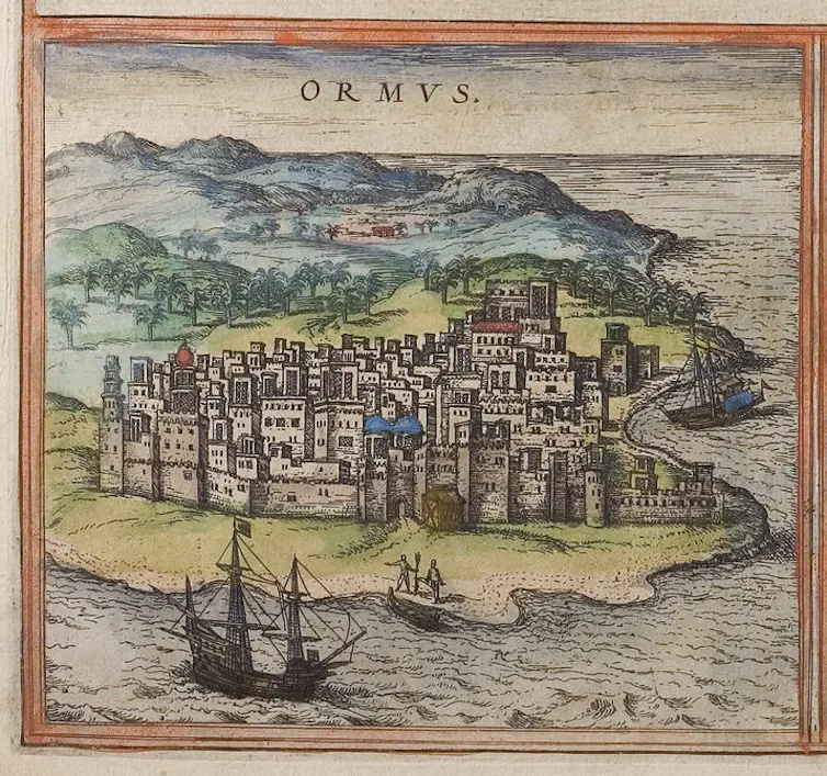 Mapa de Ormuz del siglo XVI, de la obra Civitates Orbis Terrarum, un atlas con mapas i dibujos de 546 ciudades editado por Georg Braun y Frans Hogenberg. Braun de Hogenberg. Estados del mundo, 1572, CC BI