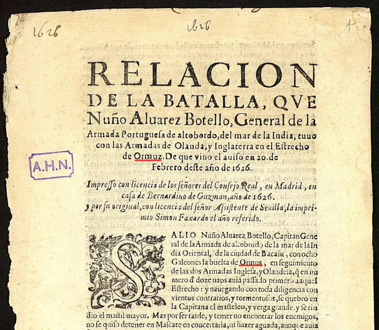 Portada del Informe de Nunja Álvarez sobre la batalla de las armadas holandesa e inglesa en el estrecho de Ormuz en 1626. Archivos Históricos Nacionales. Palabras de origen persa